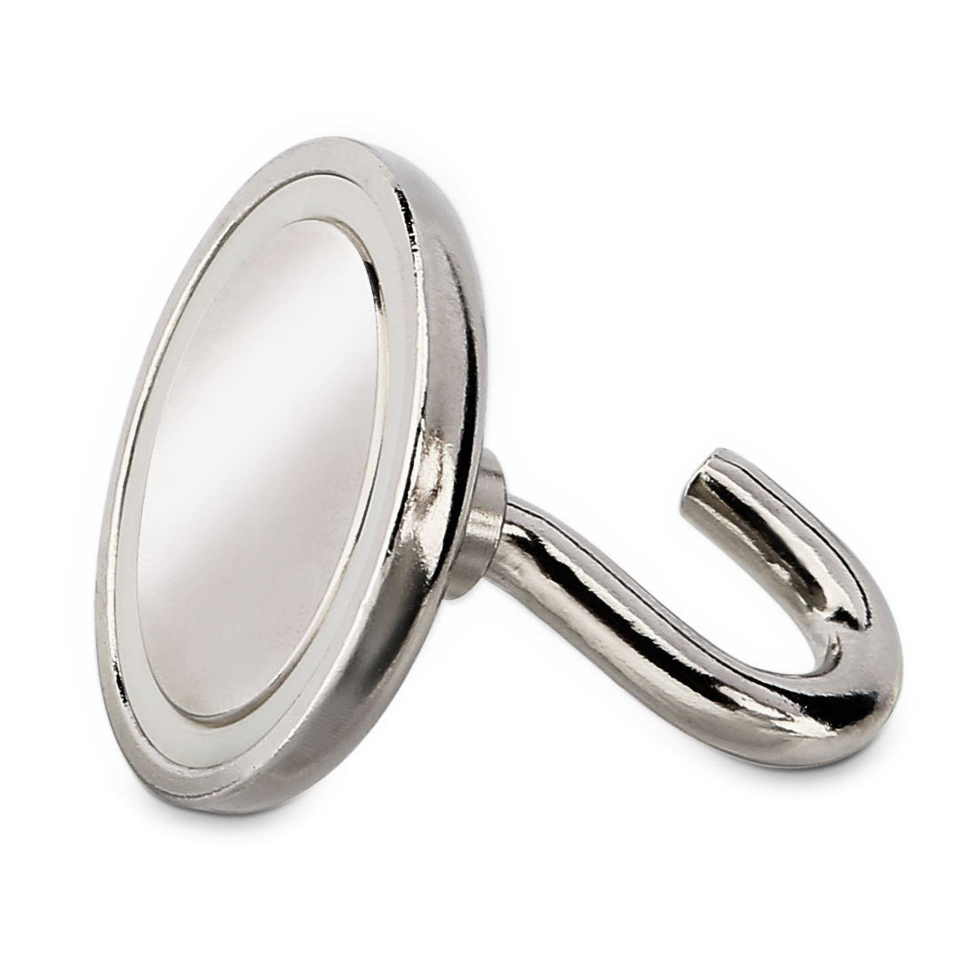 This handy and useful magnetic hook has a strong neodymium magnet embedded inside a Nickel coated steel cup to offer the maximum gripping power. A Nickel coated hook is attached to the cup magnet through a M8 threaded hole. The steel cup offers protection for the magnet and concentrates the magnetic force on the magnet surface.