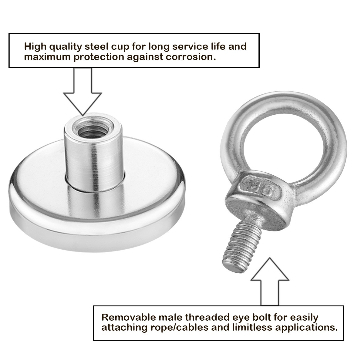 Neodymium strong magnetic eye hook fishing cups are widely used in industrial applications such as fastening, holding, hanging or retrieving objects, etc.