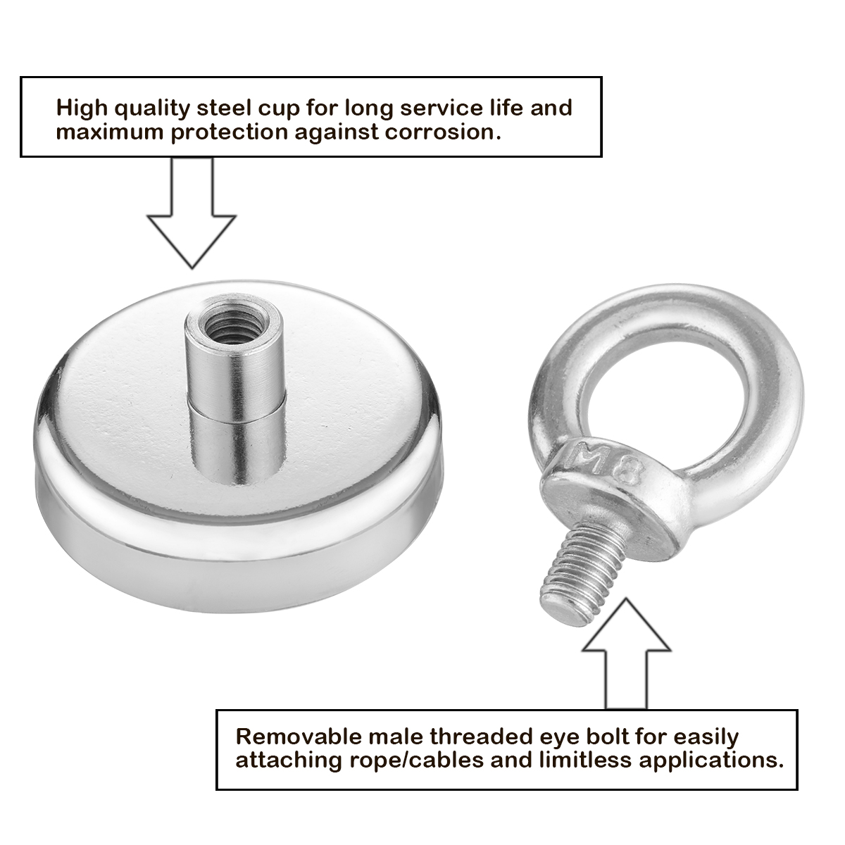 Eye Hook Fishing Cup magnets are made from neodymium magnets, the world's strongest magnets. Neodymium N42 cup magnets provide much stronger holding power than ceramic cup magnets.